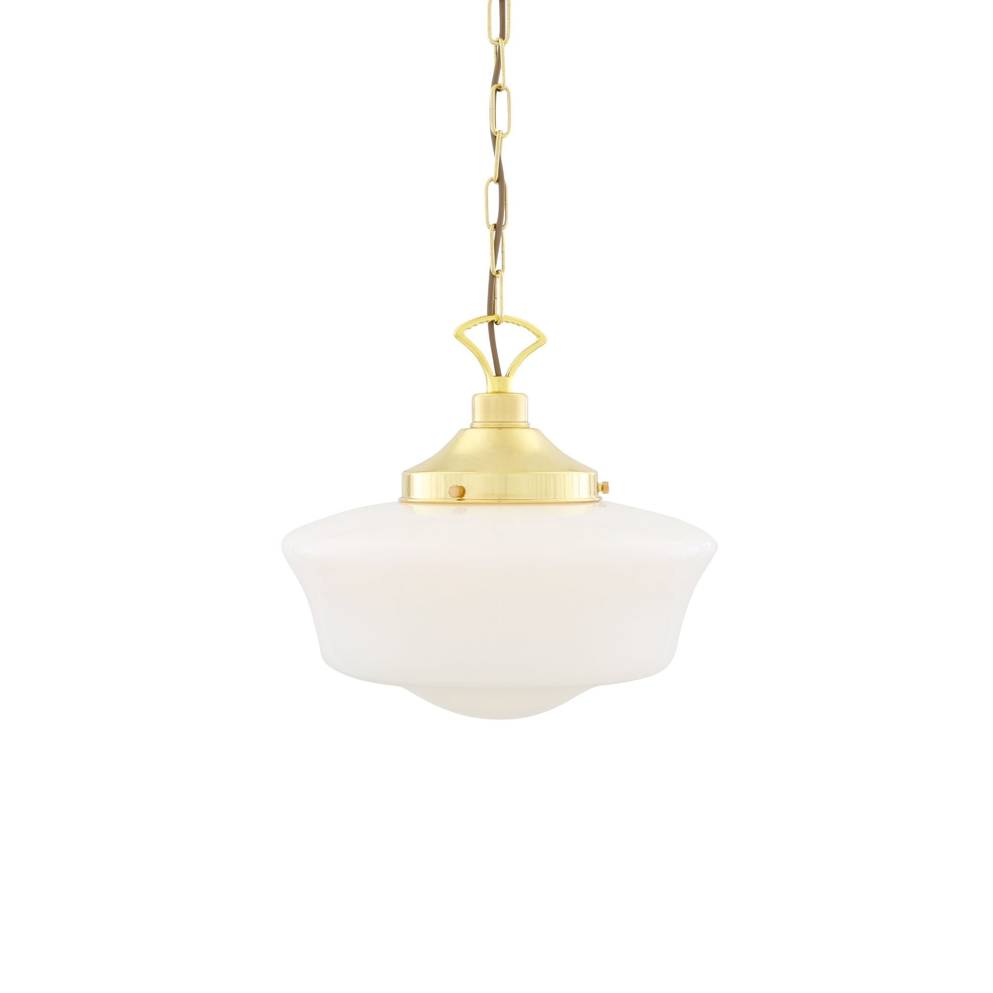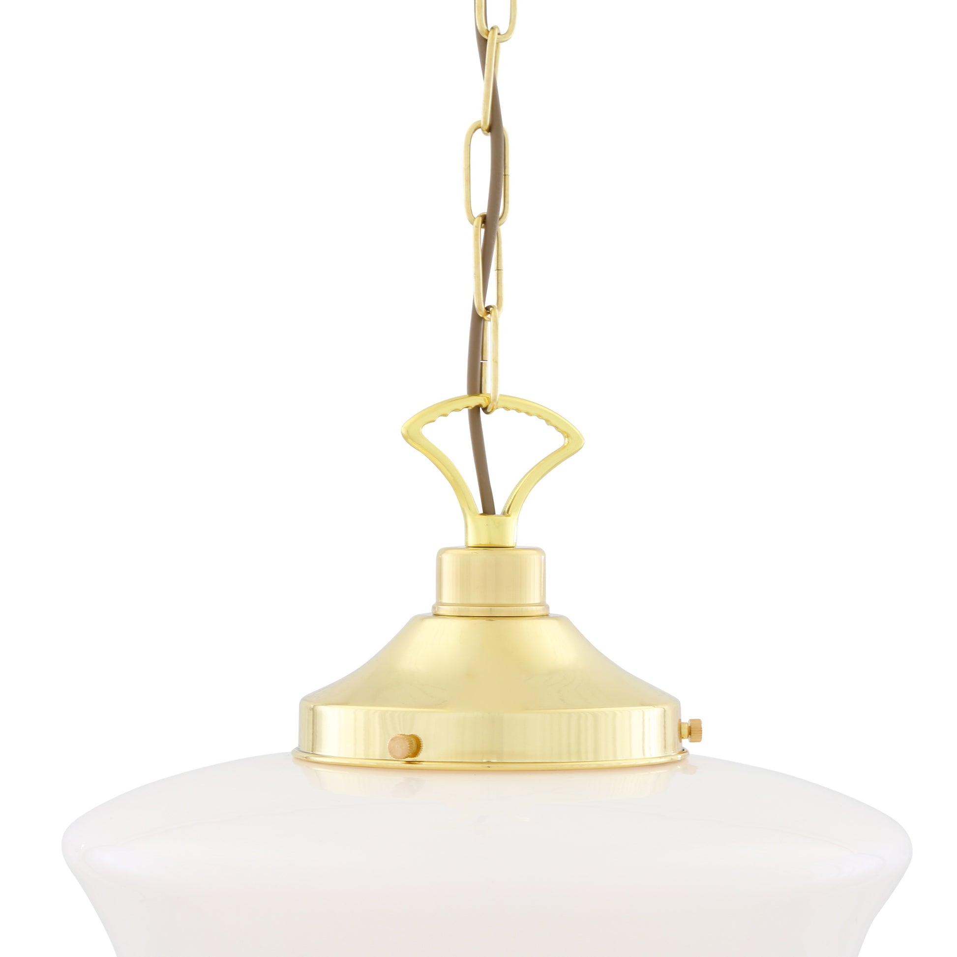 Inspired by early 20th-century design, this pendant light brings a timeless touch to kitchens, dining areas, or hallways. The smooth opal glass shade casts a soft, even glow, while the curved profile and solid brass gallery balance vintage charm with refined simplicity. Hanging from a brass chain, it feels both nostalgic and quietly elegant.