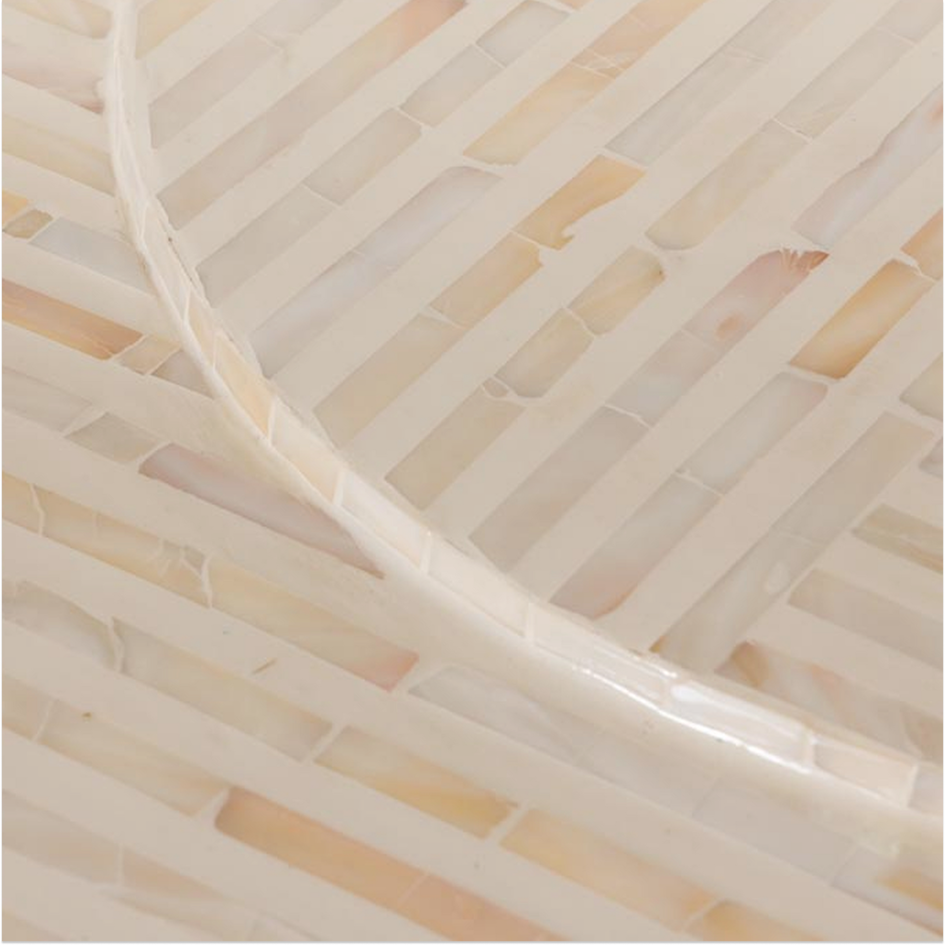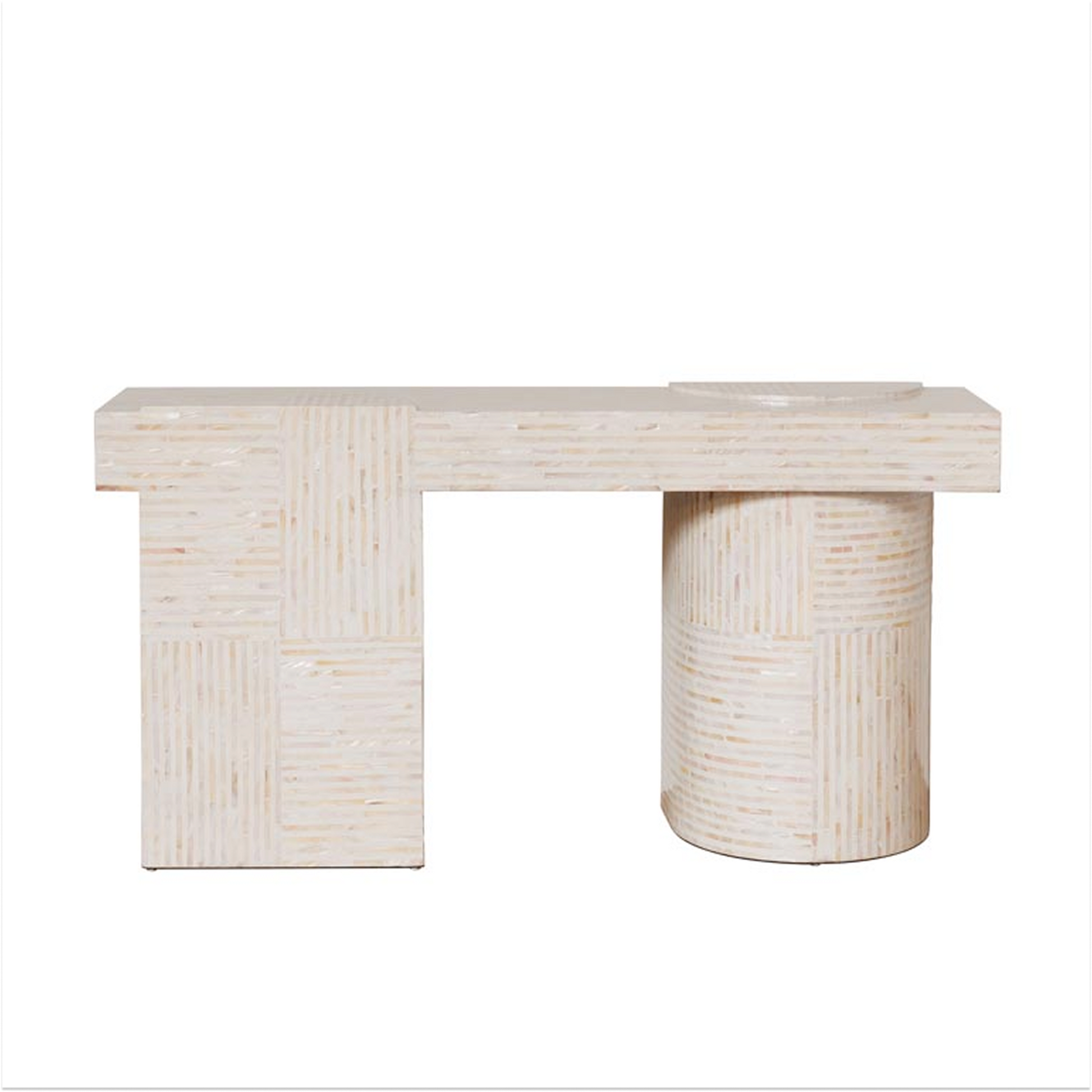 The Athènes is a striking console table that makes a bold architectural statement without sacrificing warmth or texture. Its entire surface — top and cylindrical legs alike — is clad in a finely laid bamboo veneer in a soft, bleached cream tone, creating a beautifully cohesive and tactile piece from every angle.