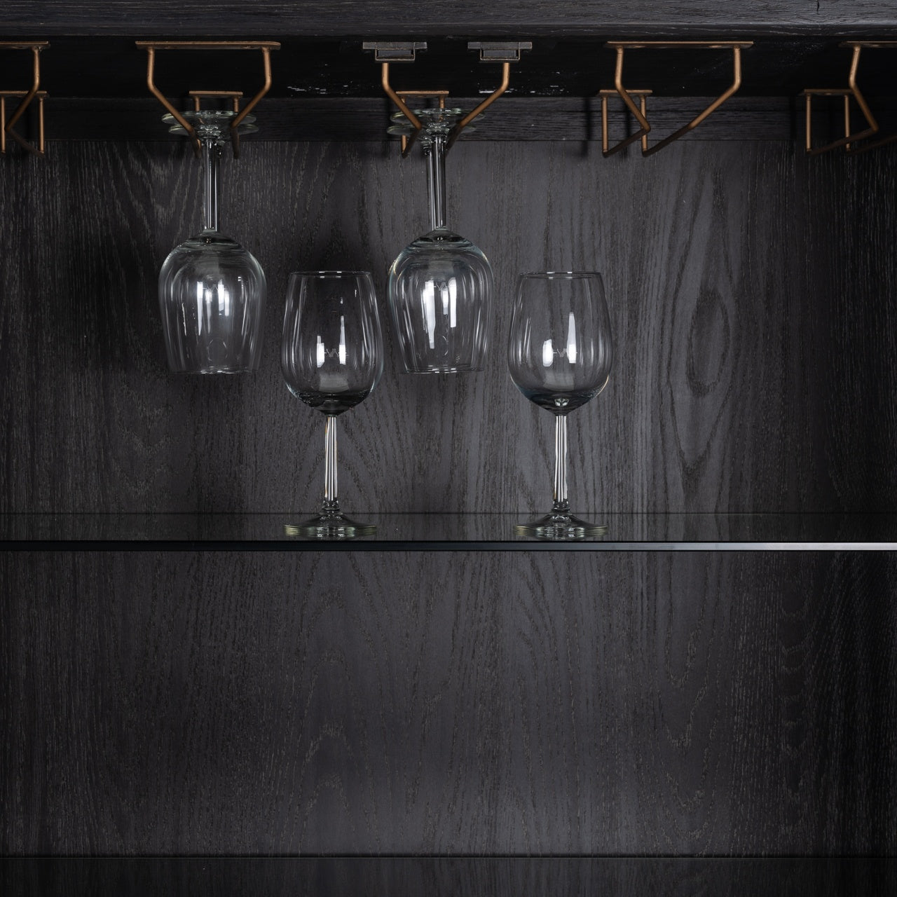 A sophisticated addition to any living space, this bar cabinet from Richmond Interiors blends Art Deco influence with modern practicality. Crafted with faux shagreen PU leather, black oak and brushed gold accents, it offers a refined focal point for entertaining. Inside, a wine glass rack, open shelving and a mirrored back provide both storage and an elegant display for bottles and glassware.