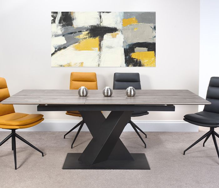 Bring contemporary style and everyday practicality to your dining space with this beautifully crafted piece from Furniture Plus. The heat, stain and scratch-resistant SmarTops® surface mimics the beauty of wood while staying durable for busy homes. A smooth central glide extender creates extra space for entertaining, while the bold black powder-coated cross-leg base adds a striking modern touch.