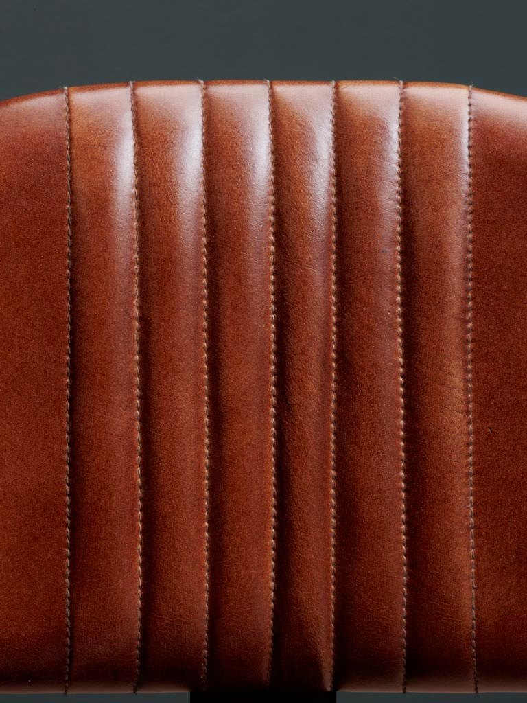 This bar stool combines clean industrial lines with a warm, natural finish. The seat is upholstered in brown leather, paired with a slim iron frame that keeps the overall design understated and practical.