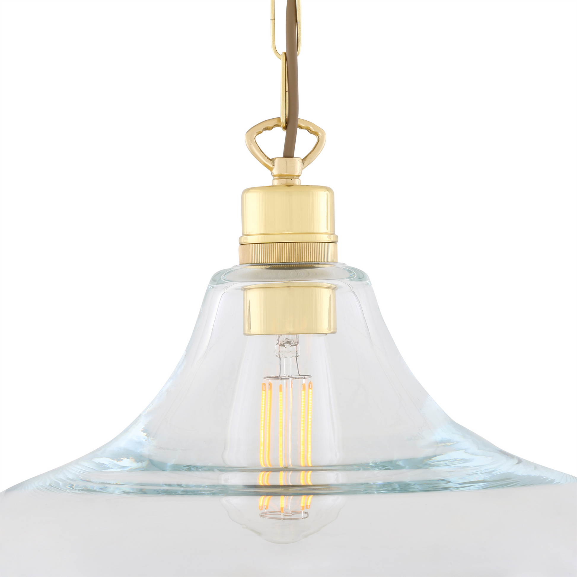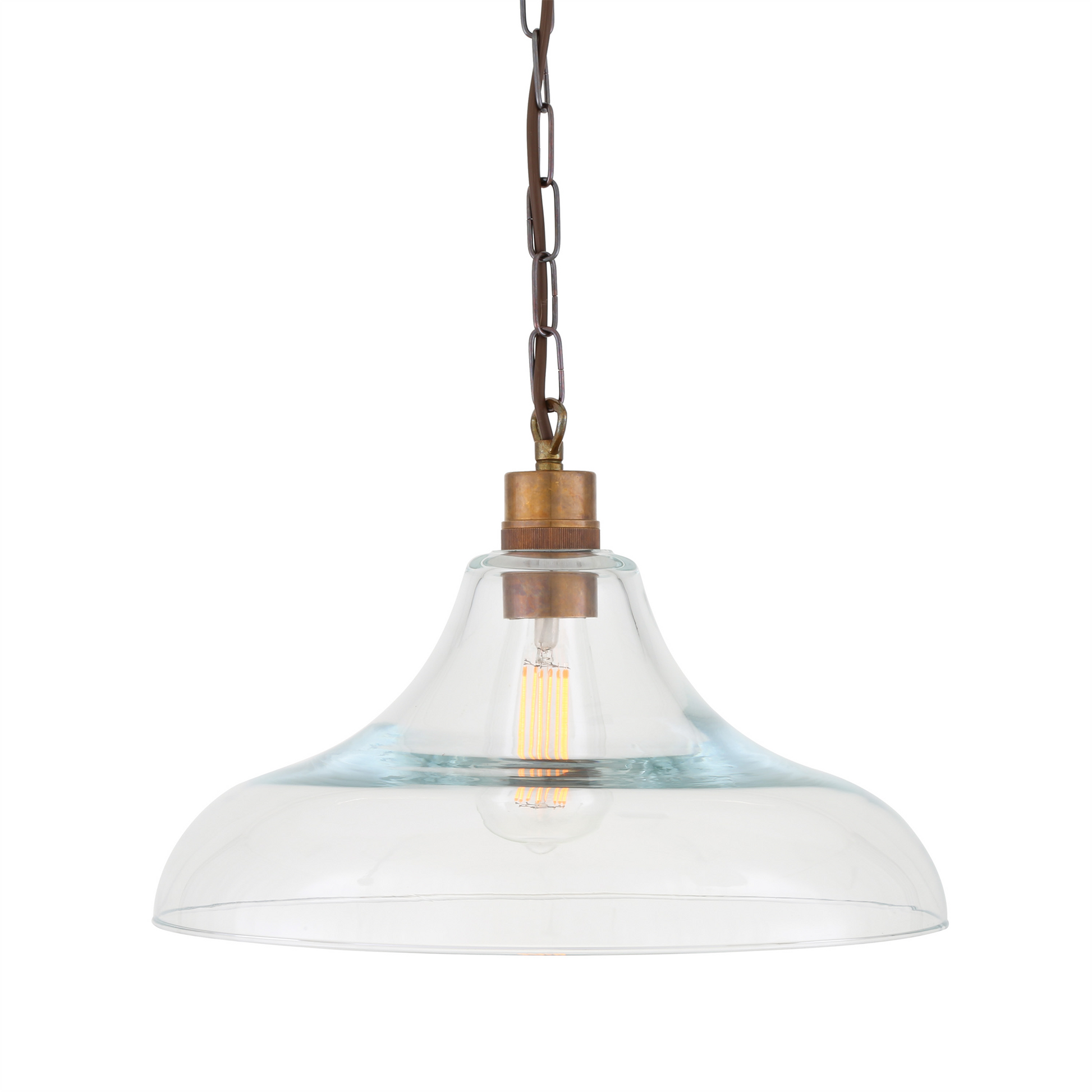 Inspired by classic railway lighting, this pendant combines a wide clear glass shade with a solid brass lamp holder, creating a strong yet balanced profile. The curved glass form allows the bulb to remain visible while delivering an open, even spread of light with minimal visual weight.