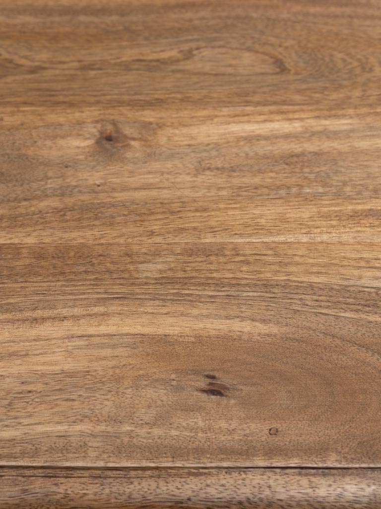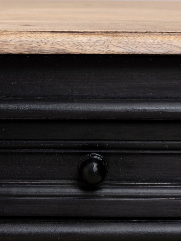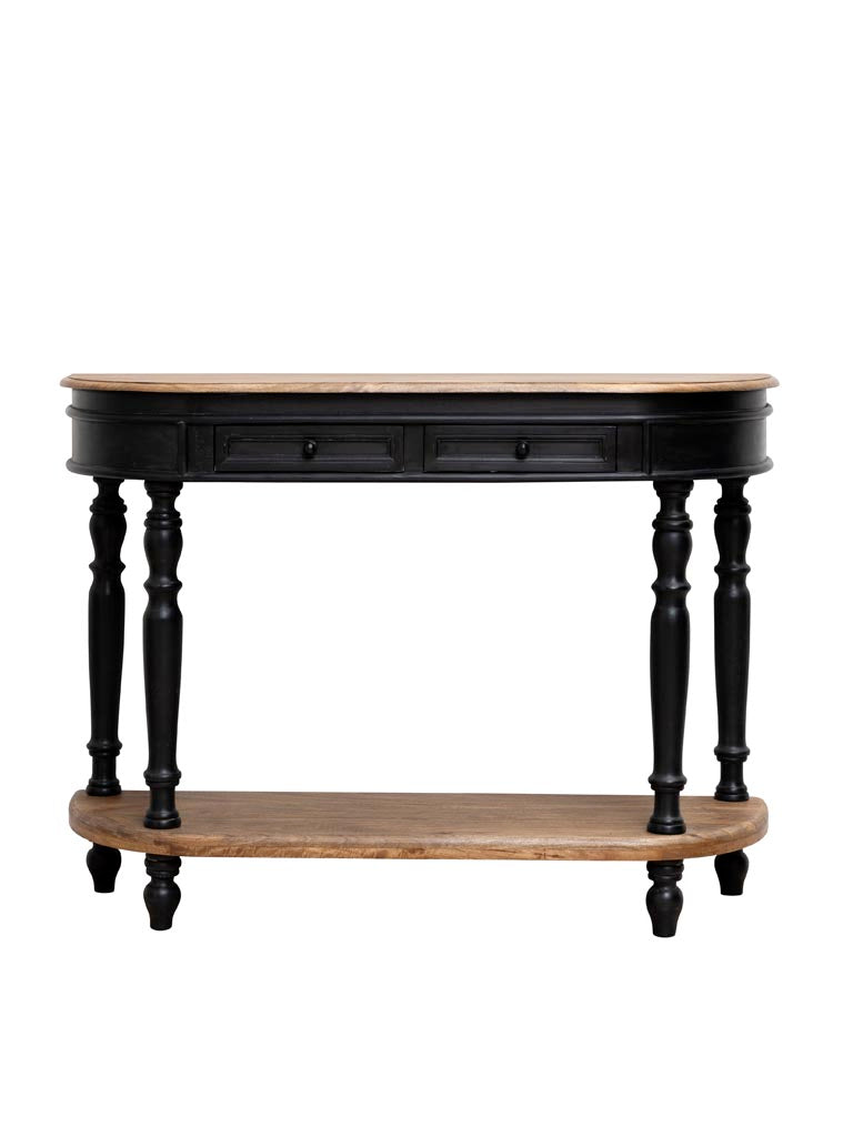 A refined design from Chehoma that balances function and style. Crafted from solid mango wood with a black-painted and natural two-tone finish, this console features two drawers and a lower shelf for practical storage. The carved legs and soft retro influence give it character without overpowering the room. Perfect for hallways, living spaces, or home offices.