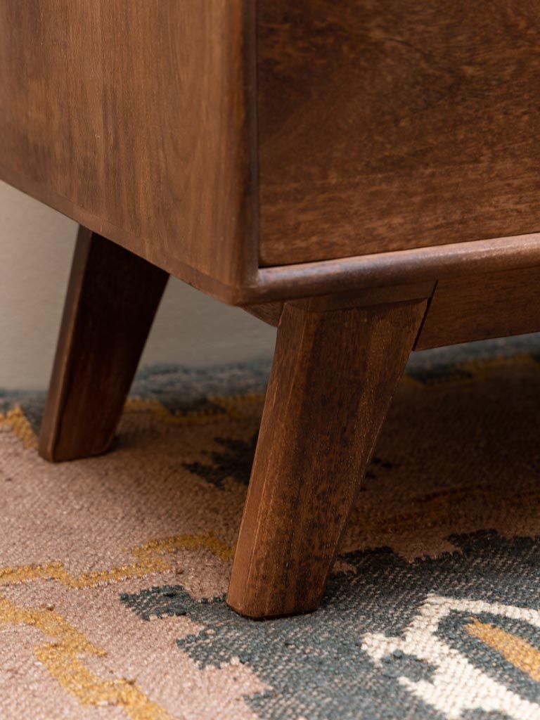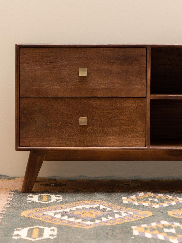 Warm mango wood and antique brass accents give this TV unit from Chehoma a refined yet relaxed feel. With its clean lines and low profile, it’s a practical piece that doesn’t shout for attention just quietly ties the room together. The open shelf and double-door storage offer space to keep things tidy and stylish.