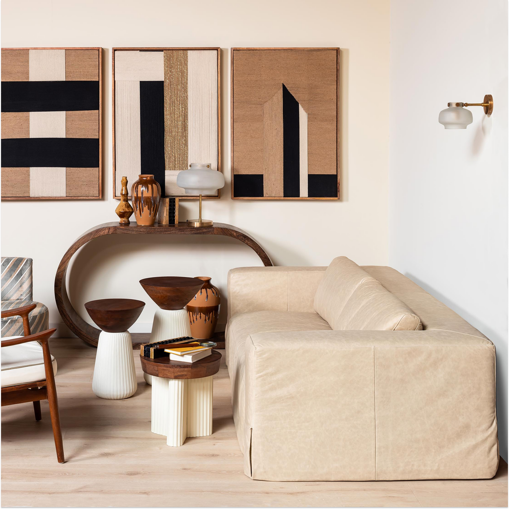 The Hudson is a beautifully relaxed 3 seater sofa that brings effortless, lived-in luxury to the modern home. Its distinctive slipcover-style upholstery in a warm sandy leather and nylon blend gives it a casually elegant, unfussy quality — the kind of sofa that looks better the more it's used.