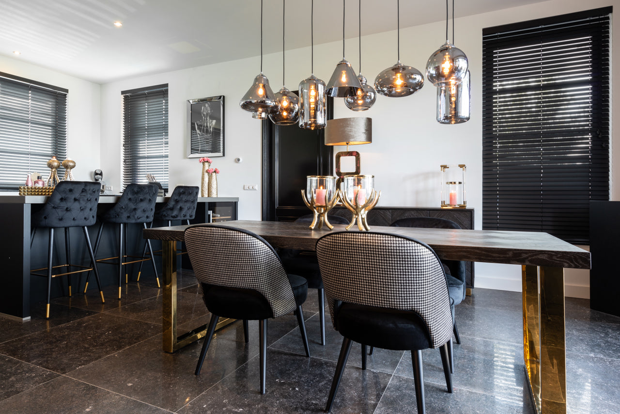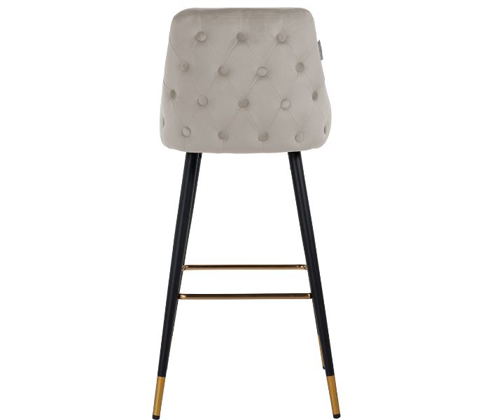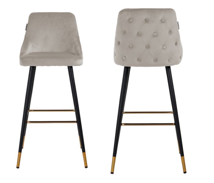 A sleek bar stool with a soft upholstered seat, designed to bring comfort and style to kitchen islands and home bars. Available in khaki or black velvet, it pairs plush fabric with slim black iron legs and subtle gold detailing for a modern yet refined look. The padded seat and supportive backrest ensure comfort, making it a practical choice for both everyday meals and entertaining.