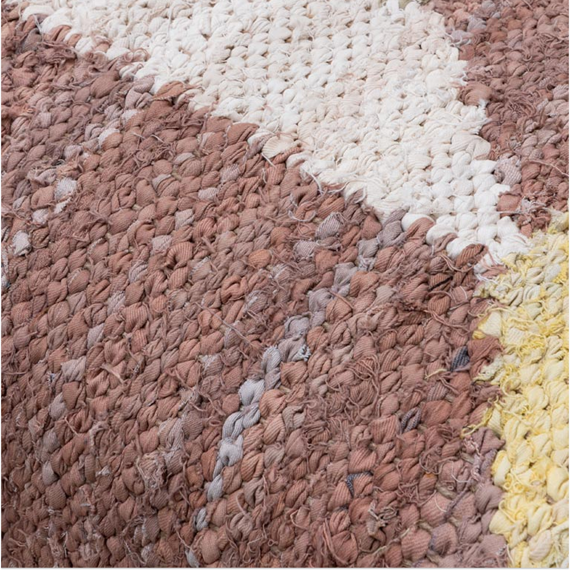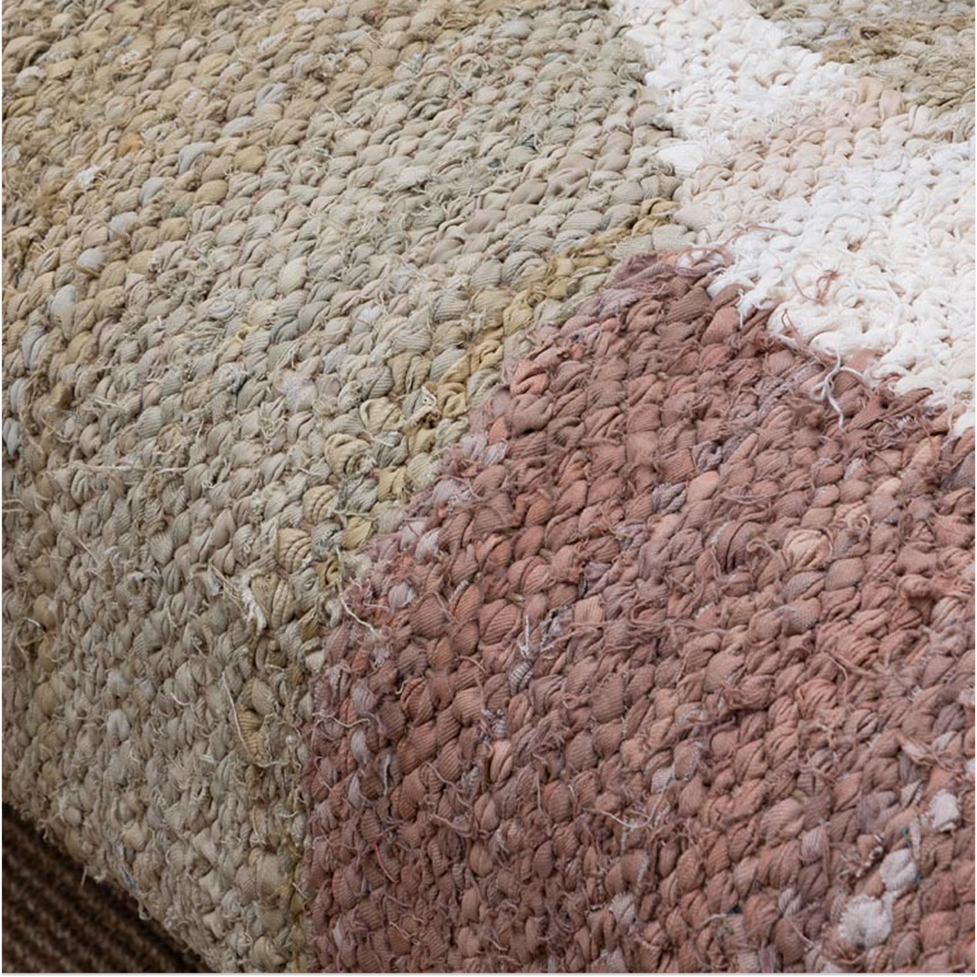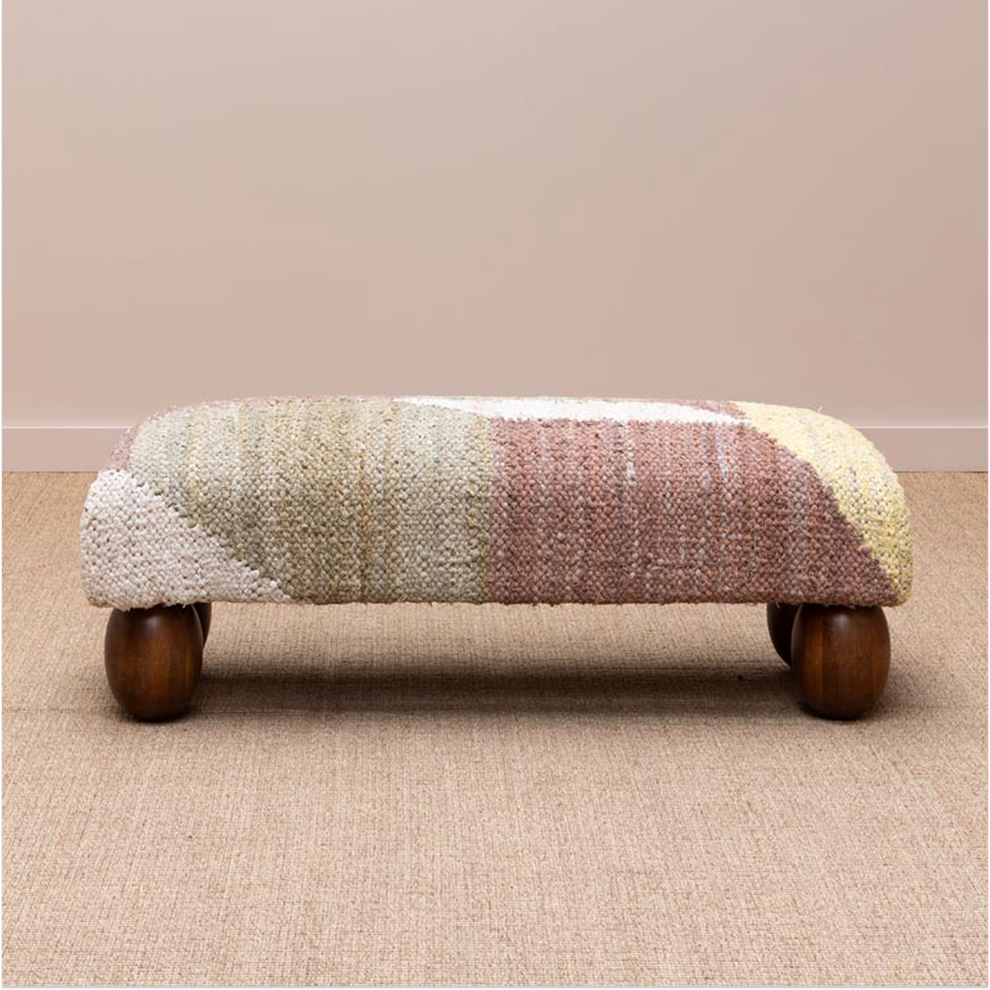 The generously padded top is upholstered in a tactile cotton fabric featuring a warm, earthy patchwork of terracotta, blush, cream, and sand tones. The result is a piece that feels both artisanal and effortlessly stylish, working beautifully at the end of a bed, in a hallway, or as a living room accent.