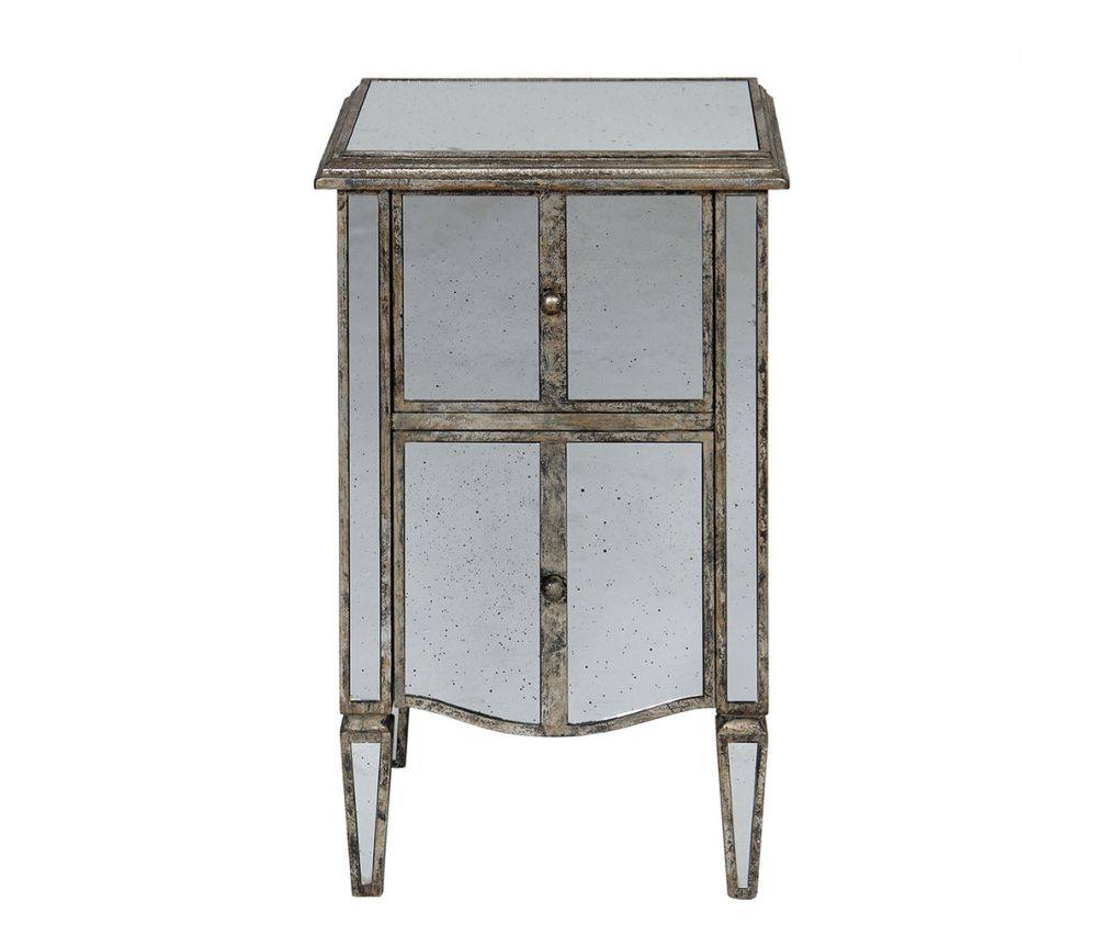 A beautifully detailed bedside table that brings light and texture to the room. The wooden frame, finished in a soft golden patina, is paired with antique-style mirrored panels that reflect the surroundings with subtle warmth. A single drawer and lower shelf provide handy storage while keeping the look elegant and uncluttered.