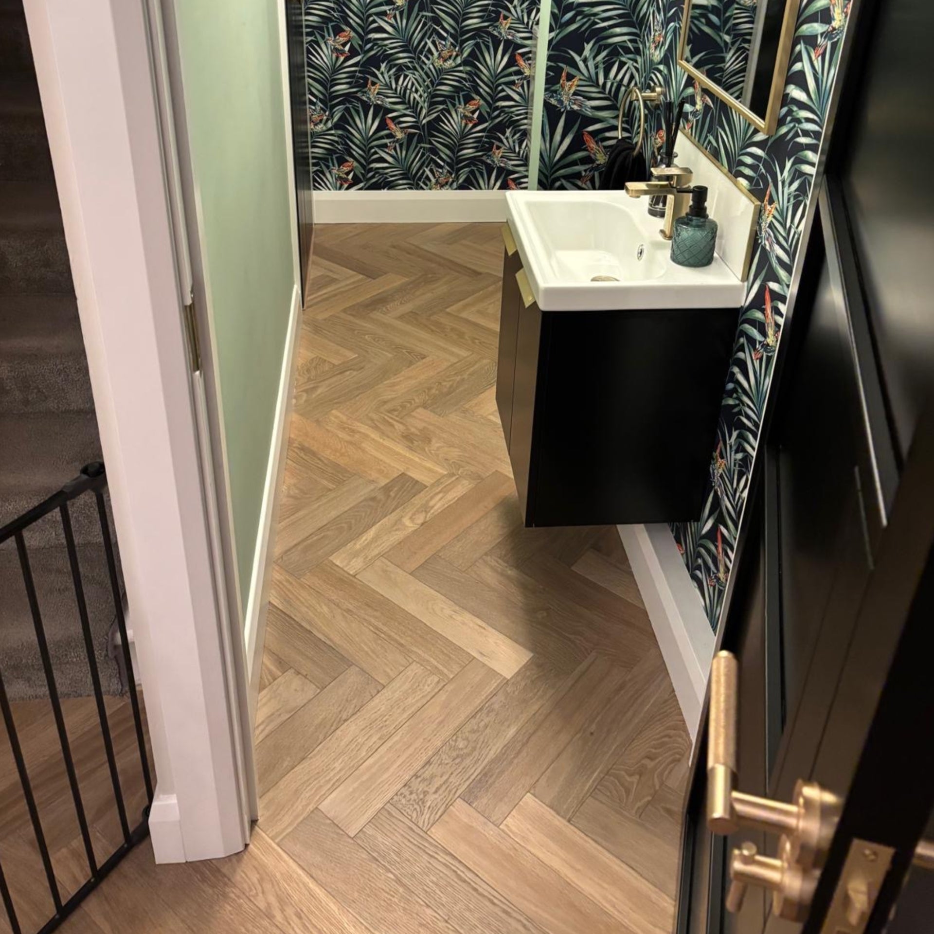 A beautiful 14 mm engineered white oak herringbone with a brushed surface and a soft UV matt finish that looks and feels like oiled timber. Character/Rustic grade brings natural colour movement and bold knots, so the pattern suits both modern and rustic schemes. Compact 90 × 450 mm tongue and groove blocks lay in a crisp parquet, and gentle smoking deepens the tone without hiding the grain. Compatible with underfloor heating and best kept to dry rooms.