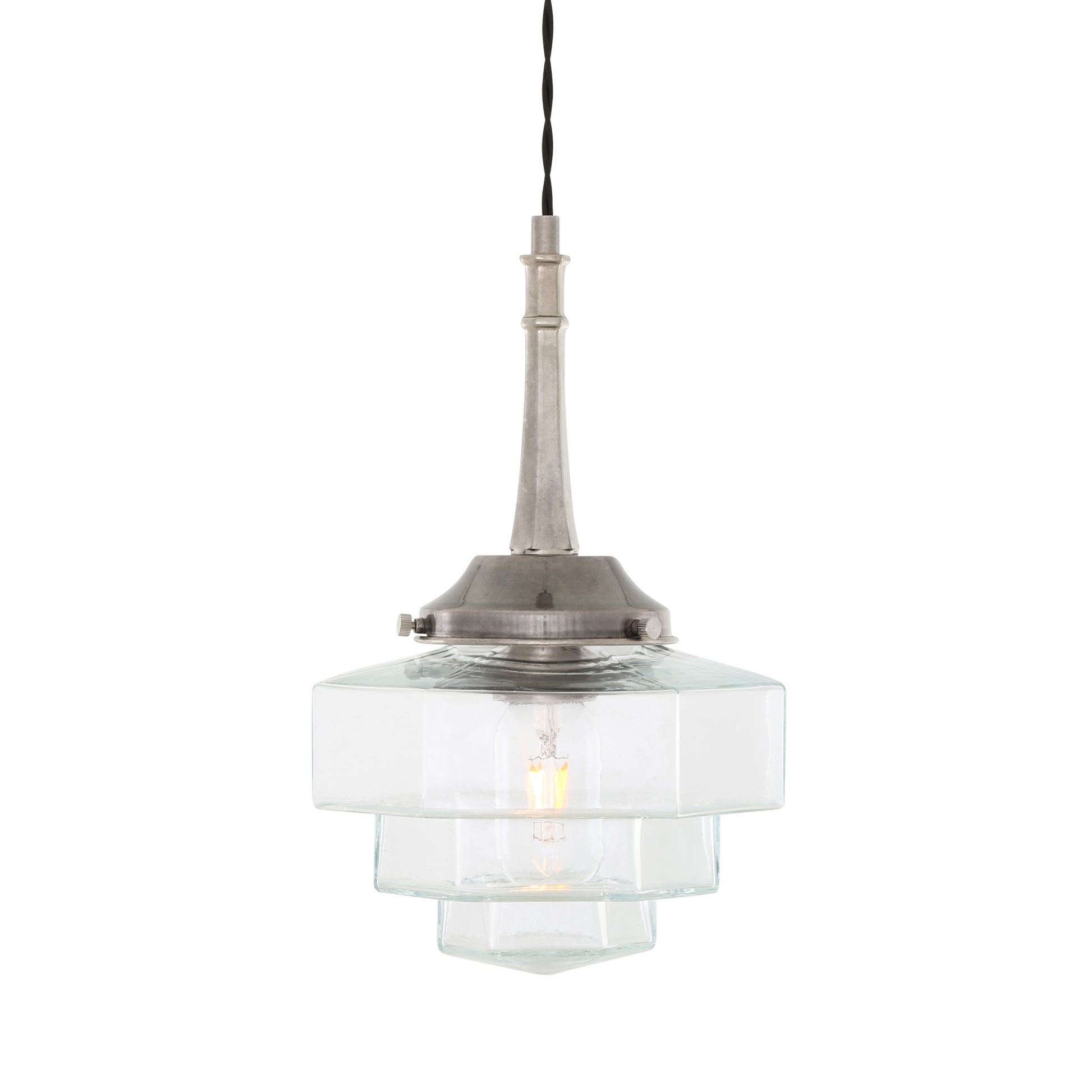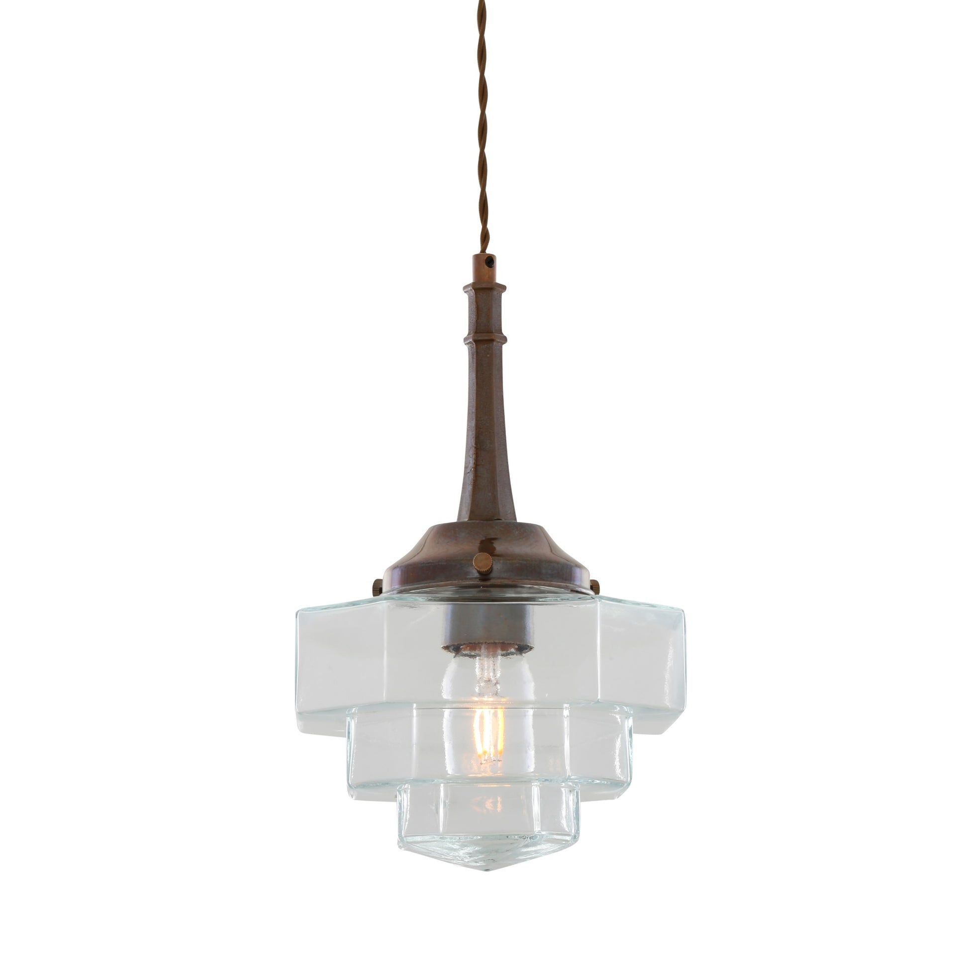 Blending geometric form with refined craftsmanship, this pendant features a layered hexagonal glass shade suspended from a slender brass stem. Its stepped design catches and diffuses light beautifully, creating depth and soft reflections.
