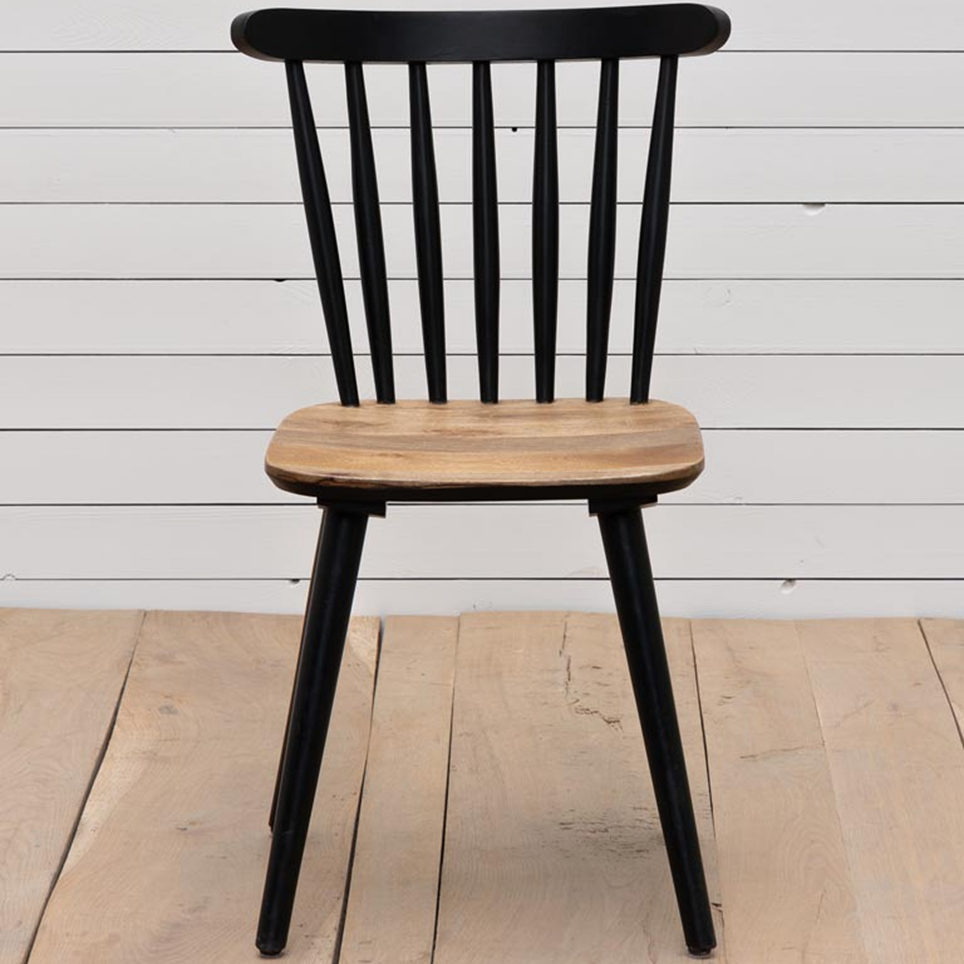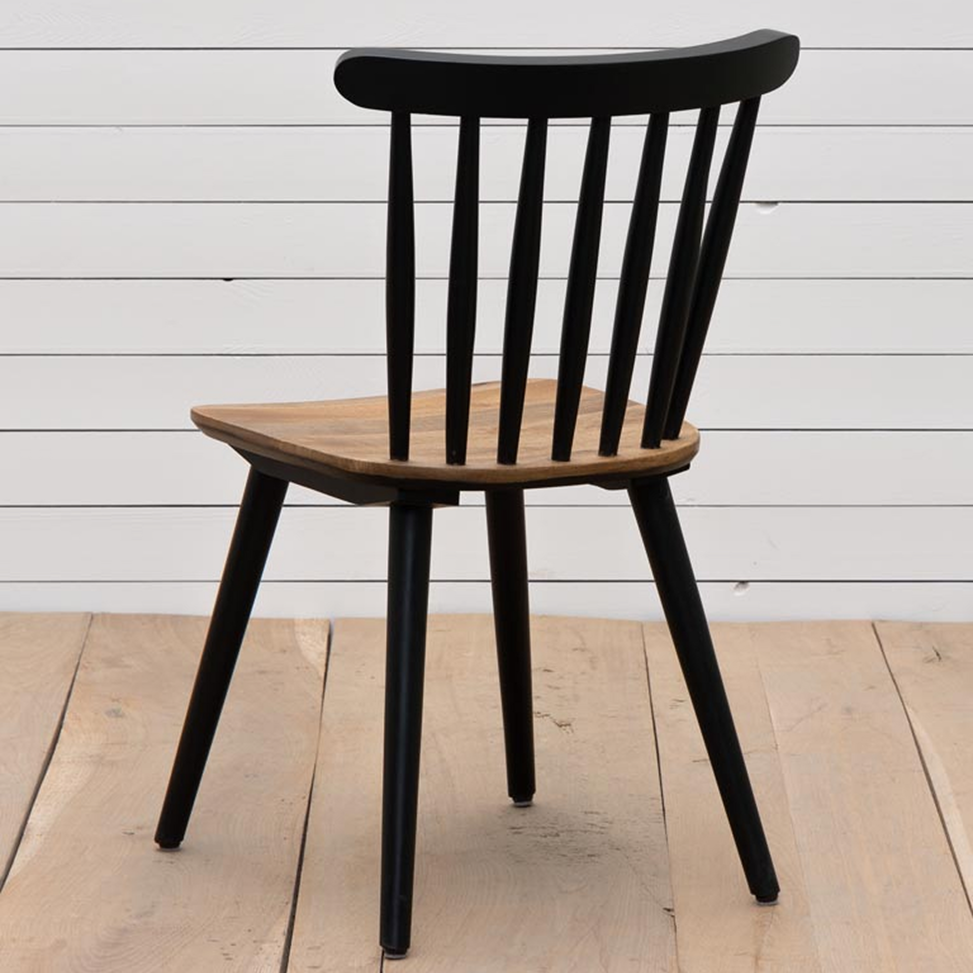 A sleek, sculptural dining chair crafted from solid mango wood with a deep black finish. The gently curved backrest and tapered spindles give it a light, elegant profile, while the natural grain of the seat brings warmth and texture.