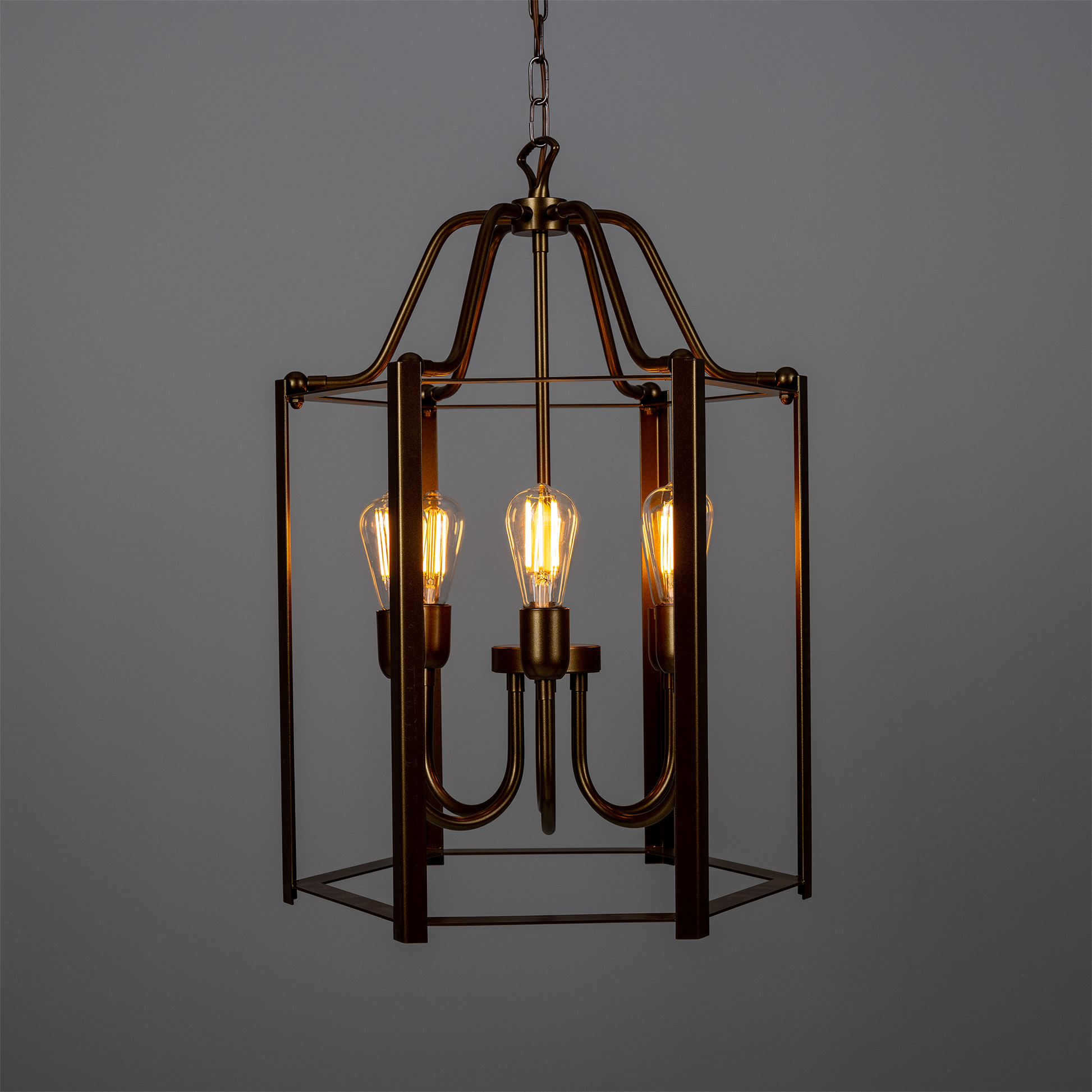 The open frame encloses multiple light sources, creating depth and visual interest while allowing light to disperse evenly. Available in four or six light configurations, the lantern has a bold yet balanced profile that brings character without feeling ornate. Finished in powder-coated metal, it offers a refined take on classic lantern lighting. Bulbs sold separately.