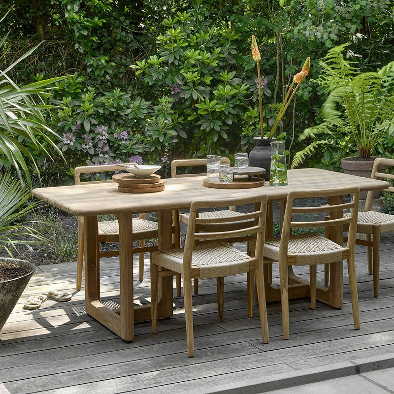 Designed to seat six to eight people comfortably, the generous surface makes it ideal for outdoor dining, entertaining and everyday use. The natural teak finish weathers beautifully over time, developing a soft silver grey patina if left untreated, while maintaining its strength and durability.