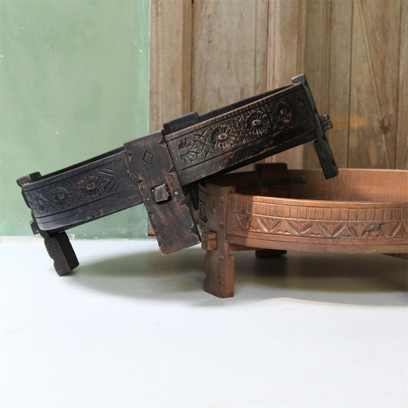 Originally used in Indian mills to grind grains into flour, this vintage grinder table from Raw Materials brings historic character to modern interiors. Its rounded shape and solid reclaimed wood make it perfect as a low coffee table, plant stand, or decorative piece. Finished in black for a bold, timeless look, it suits both rustic and contemporary spaces.