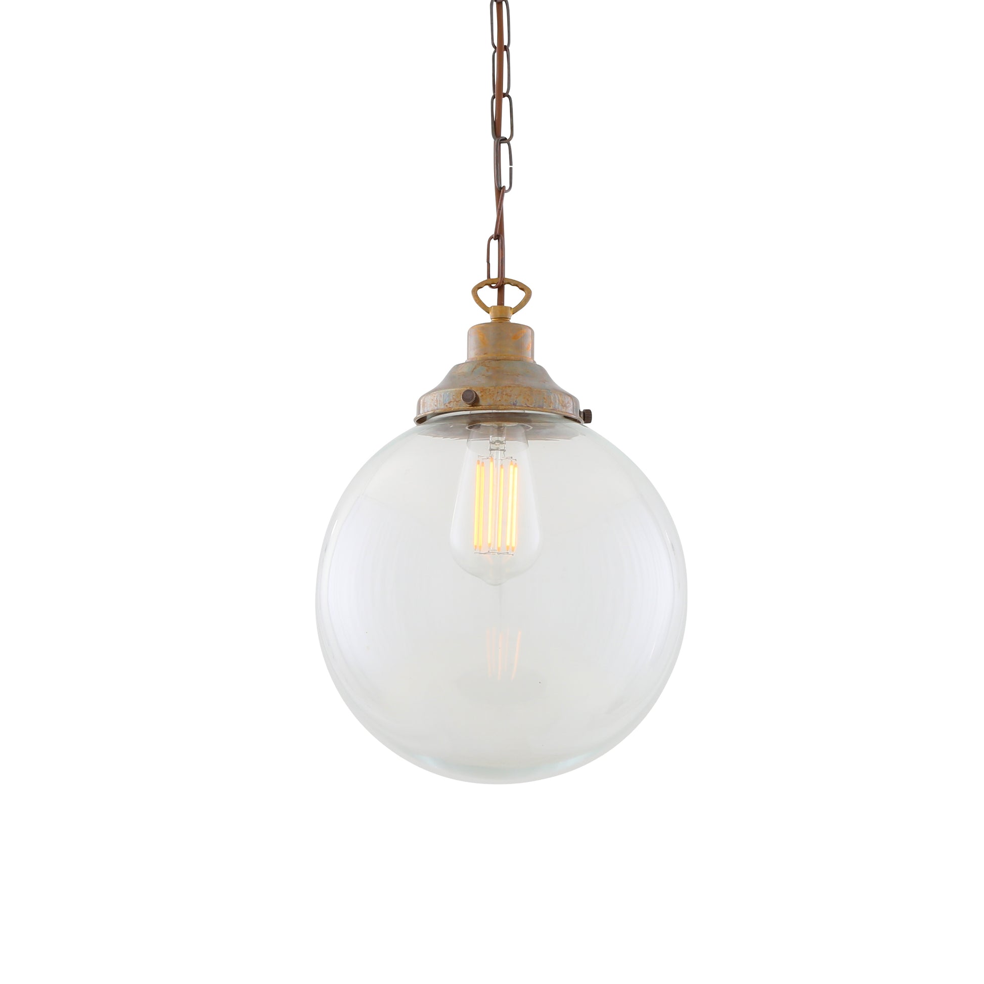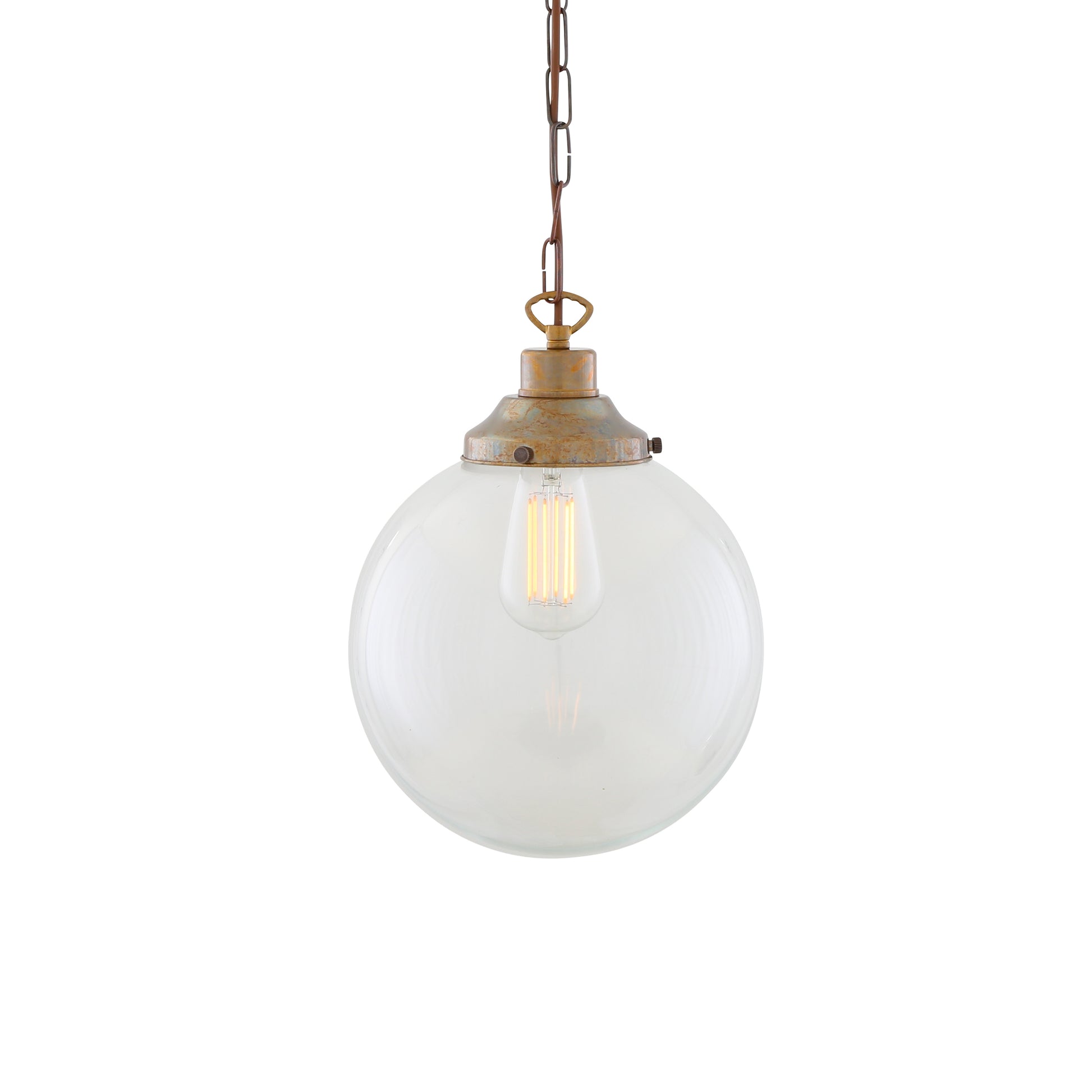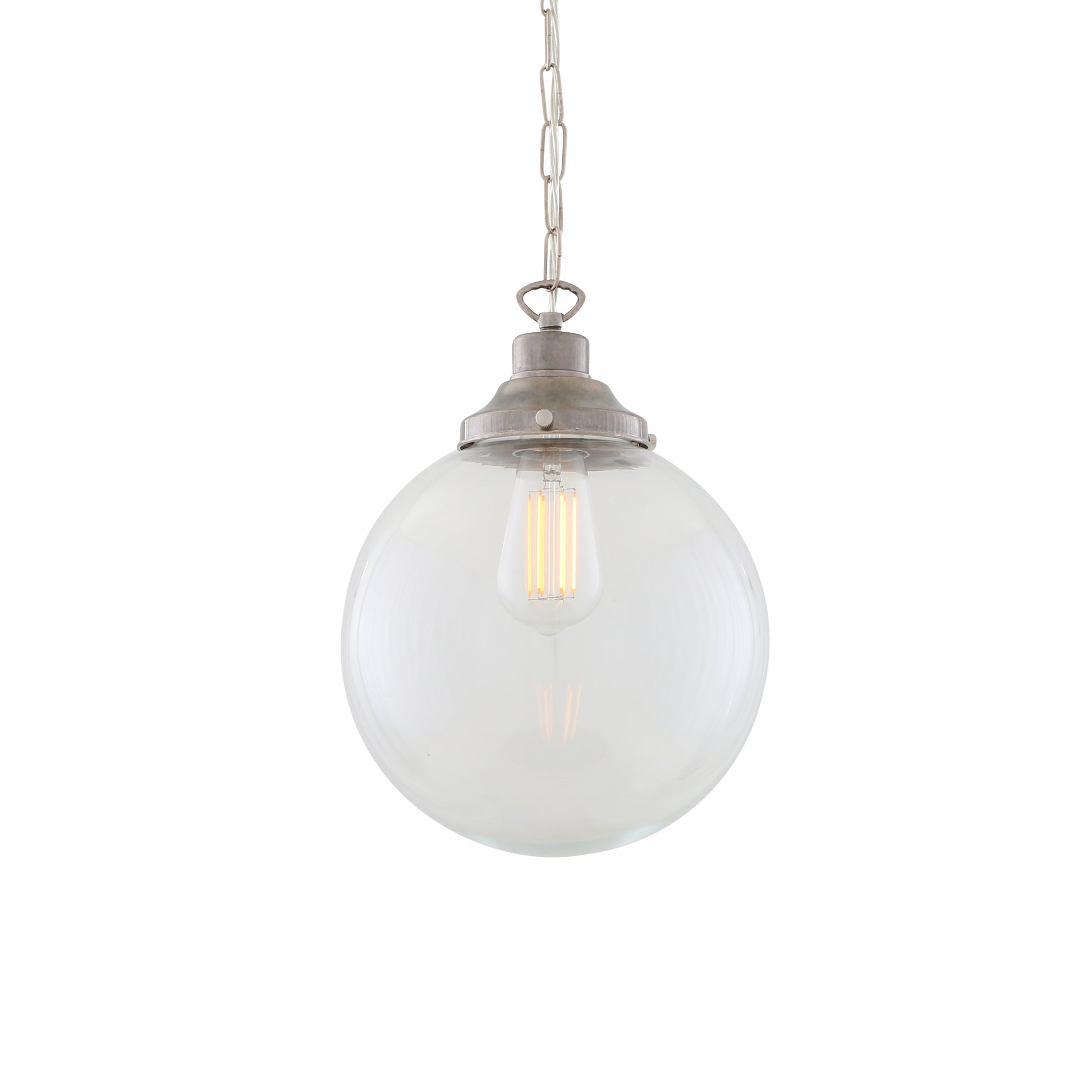 Suspended from a classic chain, it works well as a single pendant over a kitchen worktop or desk, or grouped together to create visual impact. The clear glass shade allows the bulb to remain fully visible and is best paired with an Edison-style filament bulb to achieve a warm, ambient glow. Bulb sold separately.