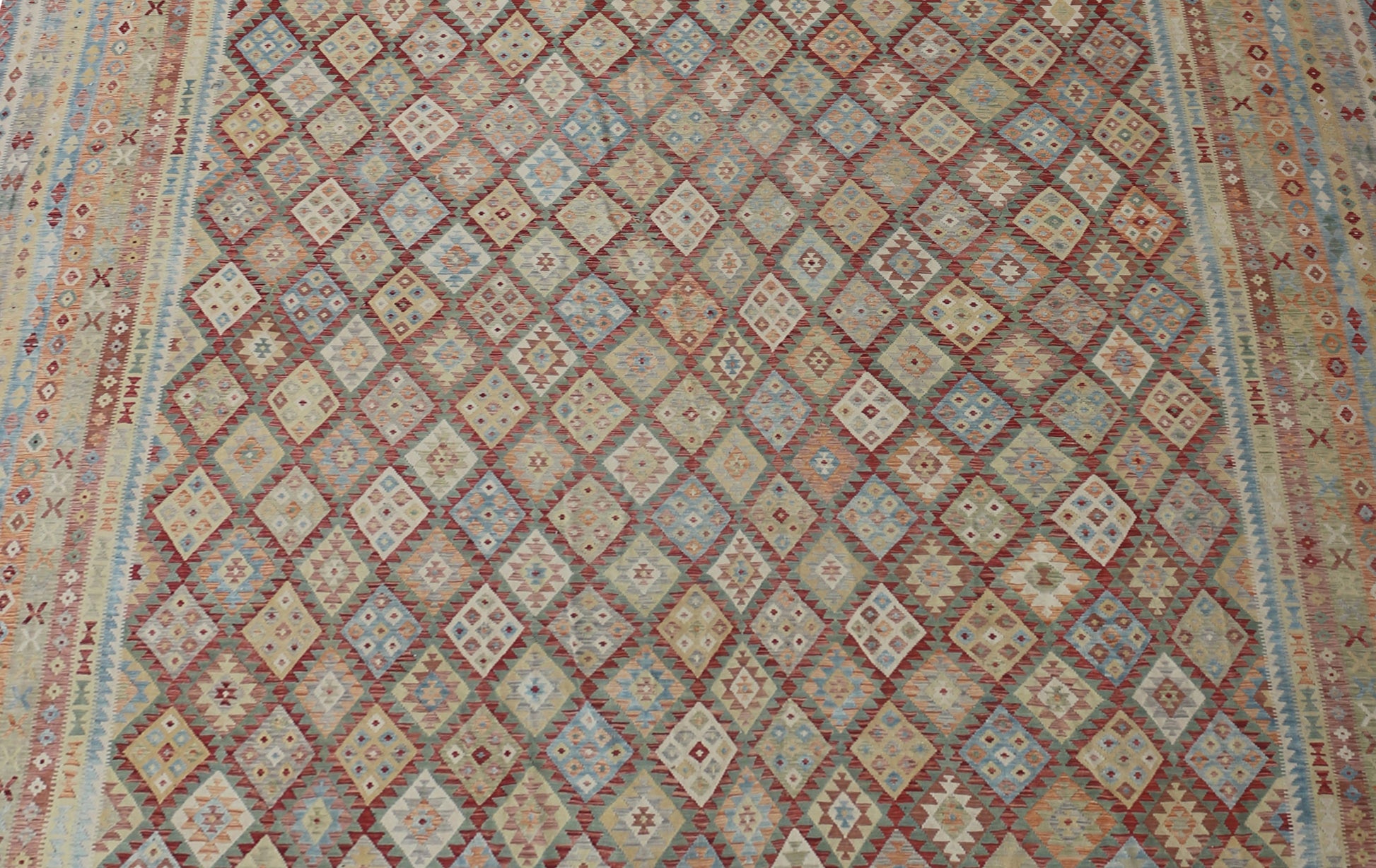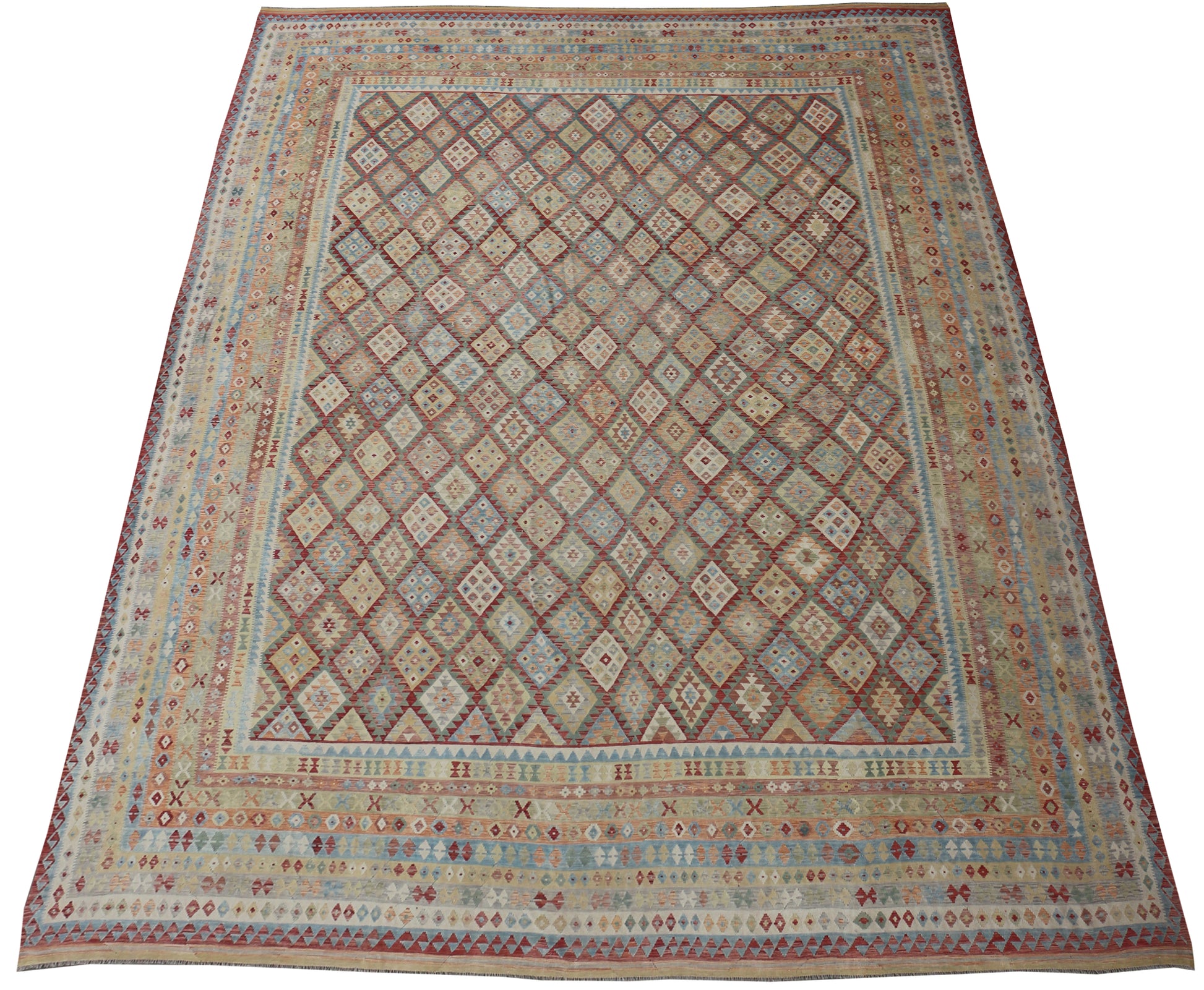 This handwoven kilim, sourced from Ornate Rugs, was made in Afghanistan using 100 percent natural wool. The large scale and classic geometric layout are filled with soft, earthy tones alongside muted blues, reds and greens. The repeated diamond motifs sit within layered borders, giving the piece a balanced and traditional look.