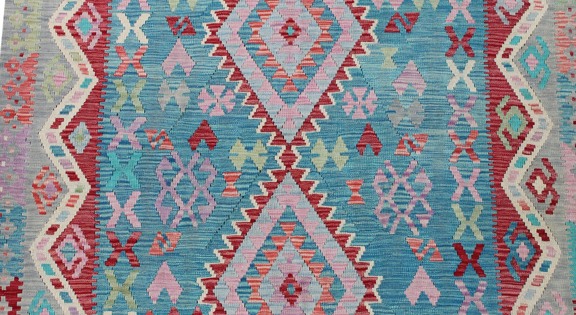 This handwoven kilim, sourced from Ornate Rugs, was made in Afghanistan using 100 percent natural wool. The design features bold central diamonds framed by lively geometric motifs, all set within a colourful border. Shades of turquoise, soft pink, lilac, mint, grey and deep red create a bright, cheerful palette with a lovely sense of movement.
