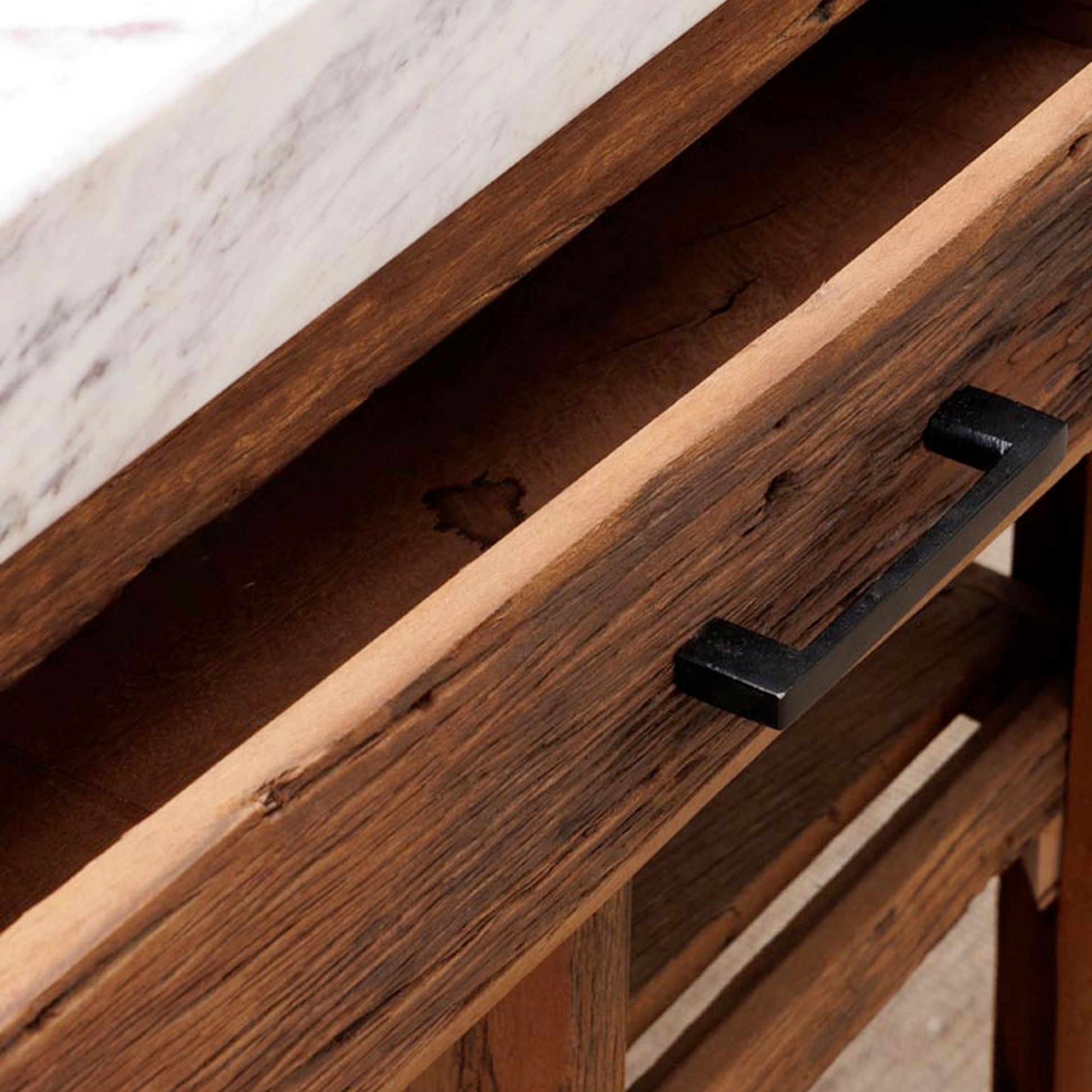 This refined counter from Chehoma combines timeless materials with thoughtful functionality. Crafted from recycled wood and topped with polished white marble, it blends natural warmth with sleek design. The clever sliding table extends your workspace or dining area, making it a stylish and practical choice for both modern and traditional kitchens.